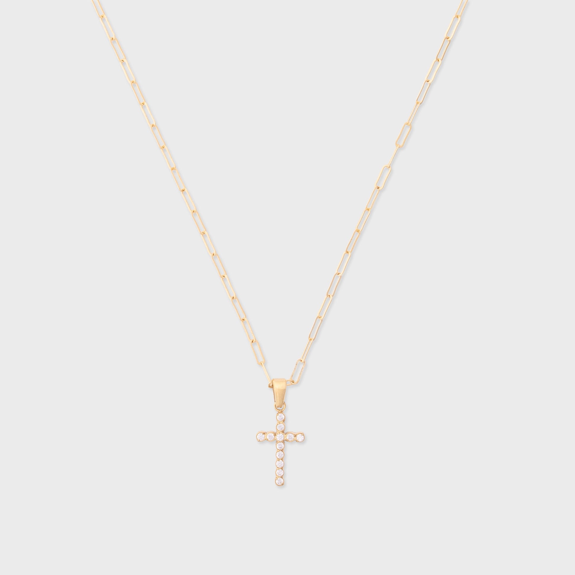 16" or 18" 14k gold filled chain with a gorgeous bezel set cz stone cross in gold PVD stainless steel.