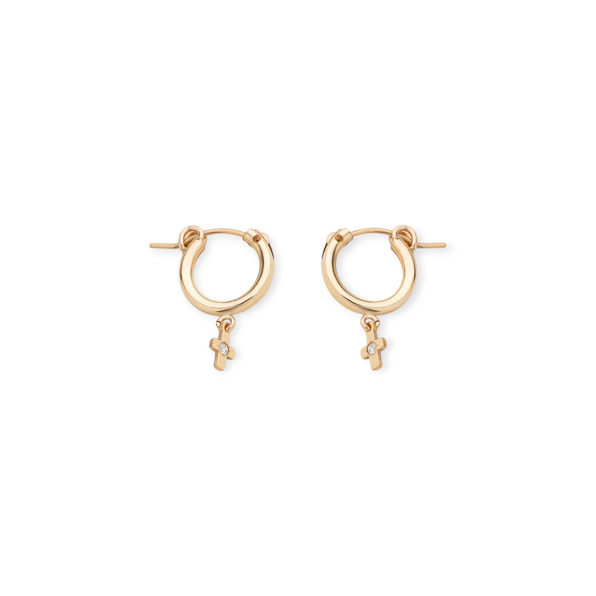 13 mm große, mit 14 Karat Gold gefüllte Creolen mit einem mit 14 Karat Gold gefüllten Kreuz und einem CZ-Stein. Handgefertigt in den USA mit recycelten Metallen. Bitte beachten Sie, dass Ohrringe für Hygienezwecke vom Umtausch ausgeschlossen sind.