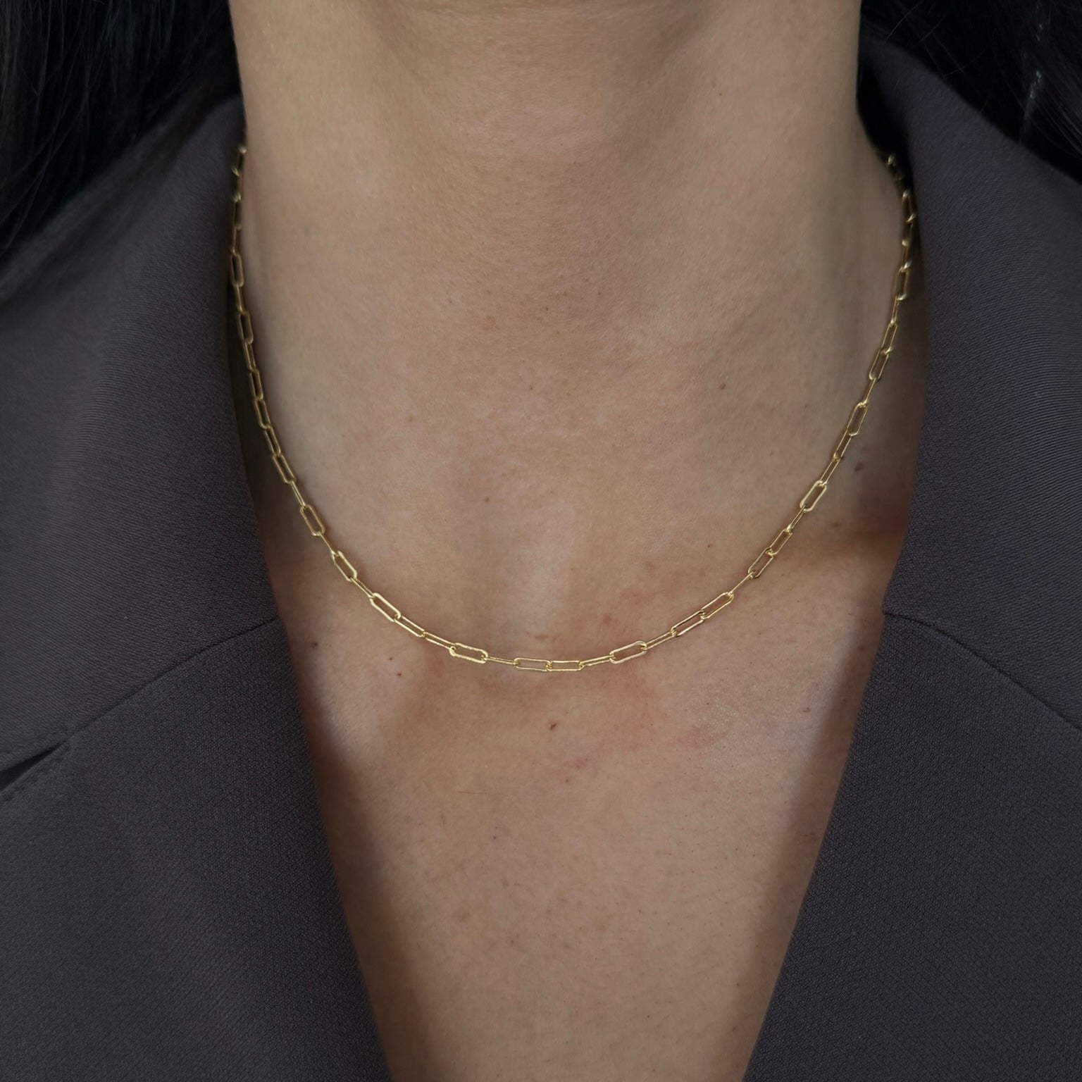 Deine Layering-Freundin. Halskette mit 14-Karat-Goldfüllung. Hergestellt aus recycelten Metallen. Das Model trägt beide verfügbaren Längen. oben (16") und unten (18").
