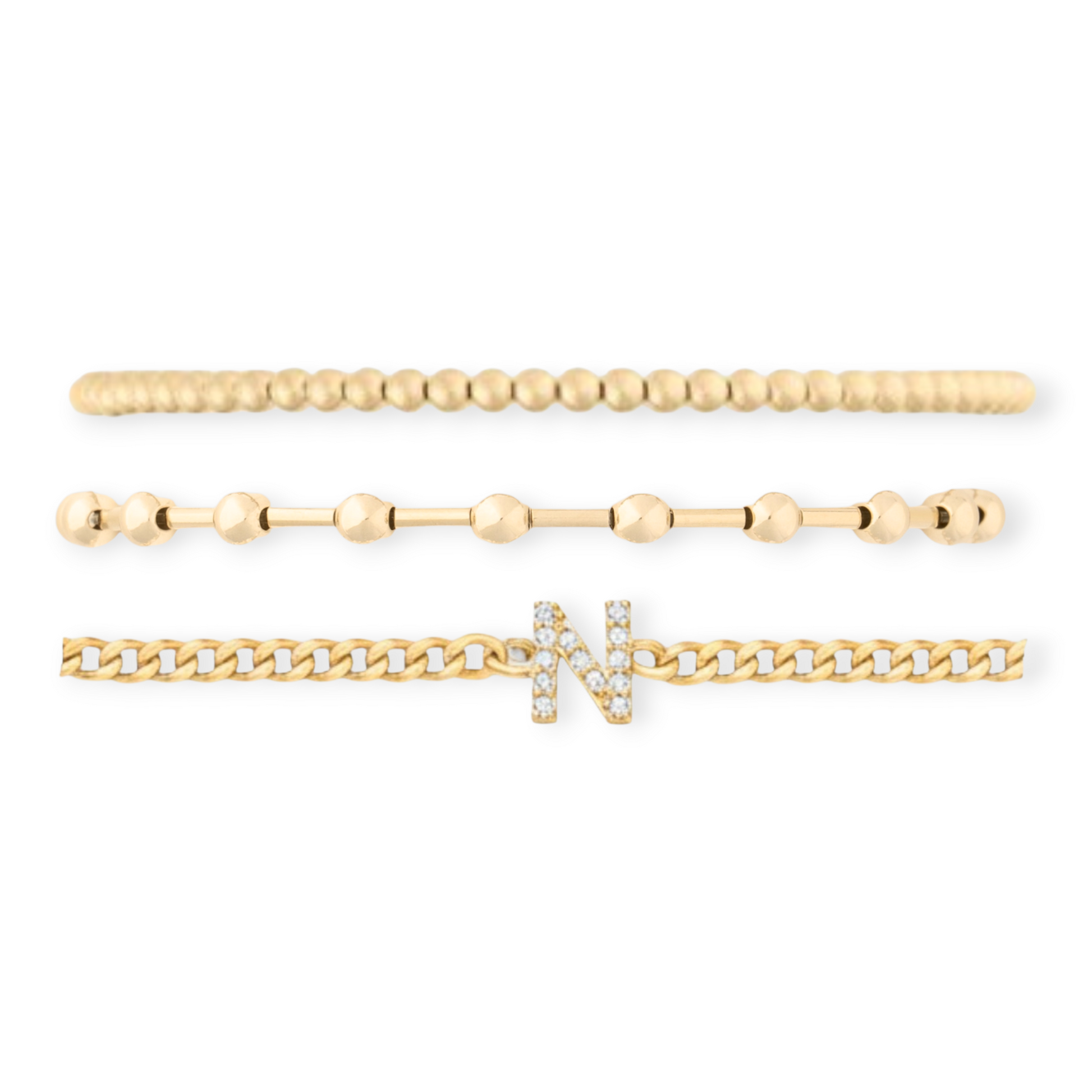 custom stack meets everyday chic. combine three gorgeous 14k gold filled bracelets, including two 14k gold filled bead bracelets on stretch cord with a 14k gold filled curb chain bracelet with a custom pave initial made from gold PVD stainless steel. handmade with recycled metals in the usa.