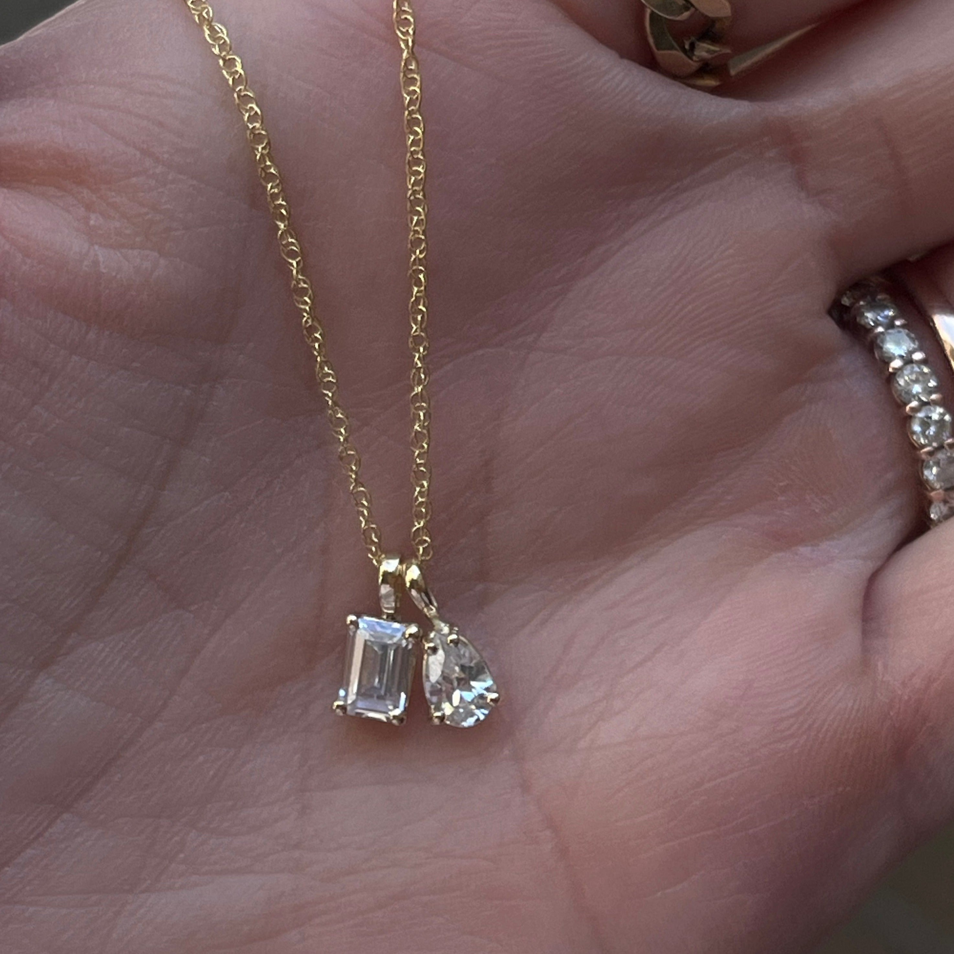 our most show stopping piece yet. solid 14k gold 18" dainty necklace with a CZ pear stone and a CZ emerald stone. handmade with recycled metals in the USA.
