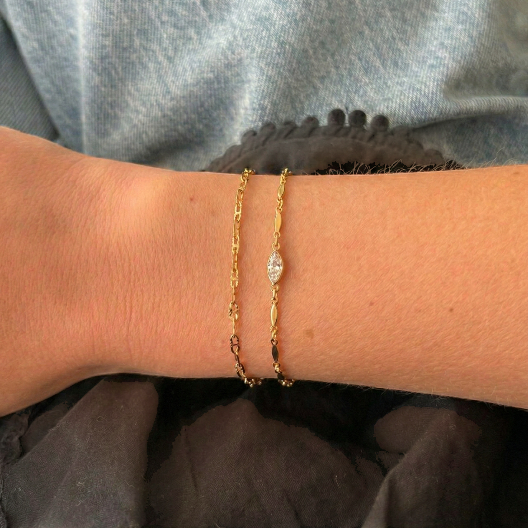 combining two of our favorite dainty 14k gold filled bracelets for a perfect everyday stack. this stack includes a 14k gold filled mariner chain with a 14k gold filled bar chain set with a bezel set marquise cubic zirconia stone. handmade with recycled metals in the usa.