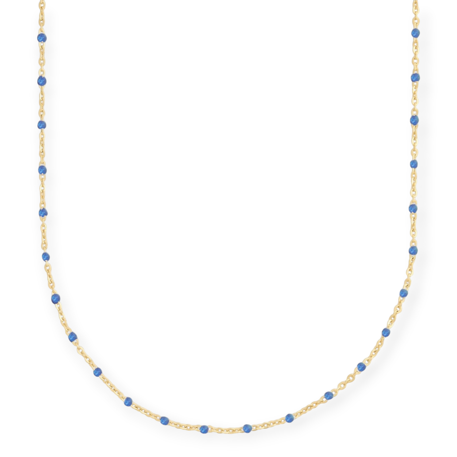 the perfect summer layering piece. 16-18" adjustable gold filled necklace with blue enamel beads. handmade with recycled metals in the usa.