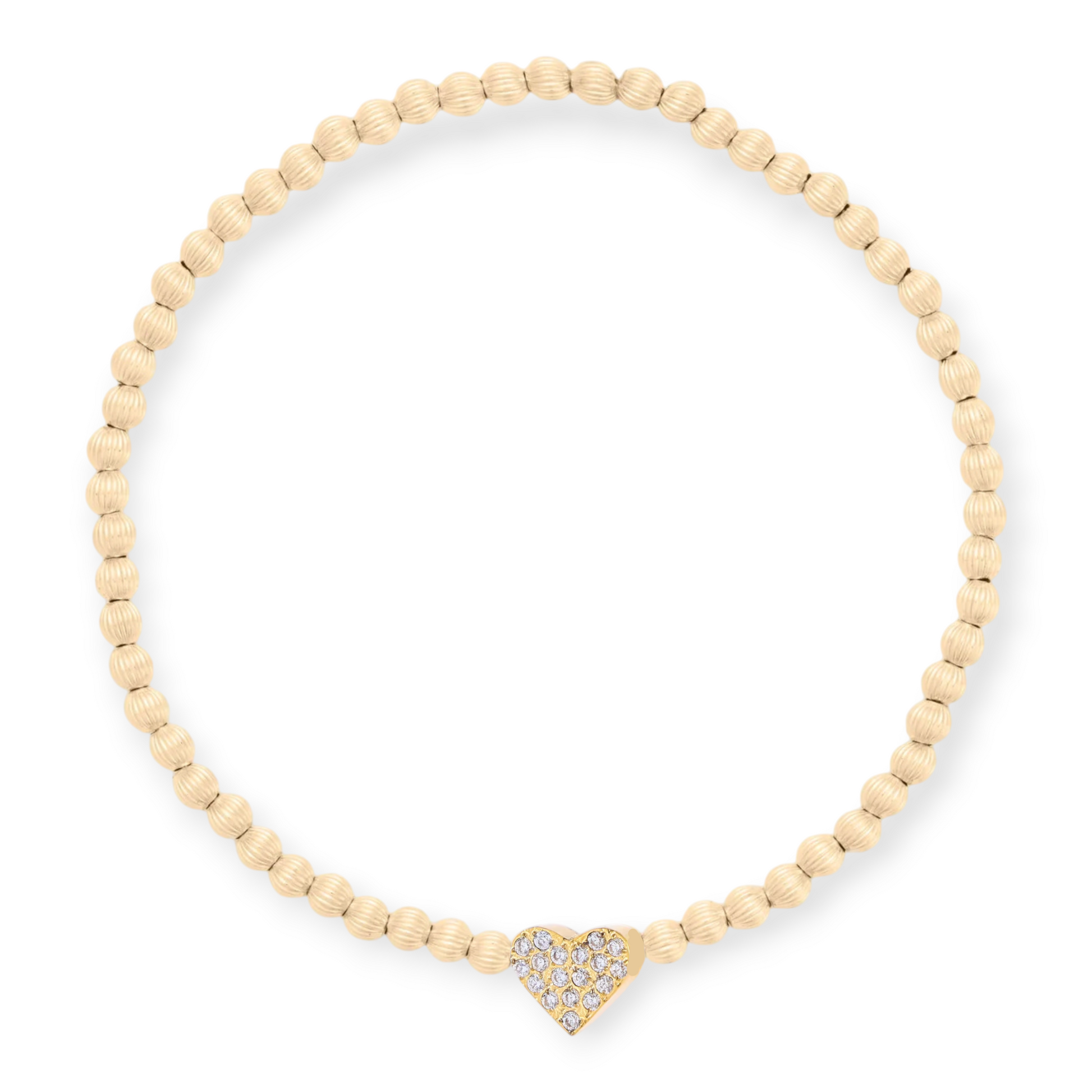 the girliest fanciest bead bracelet on our team. 14k gold filled corrugated beads with a gold PVD stainless steel pavé heart bead at center. handmade with recycled metals in the USA.