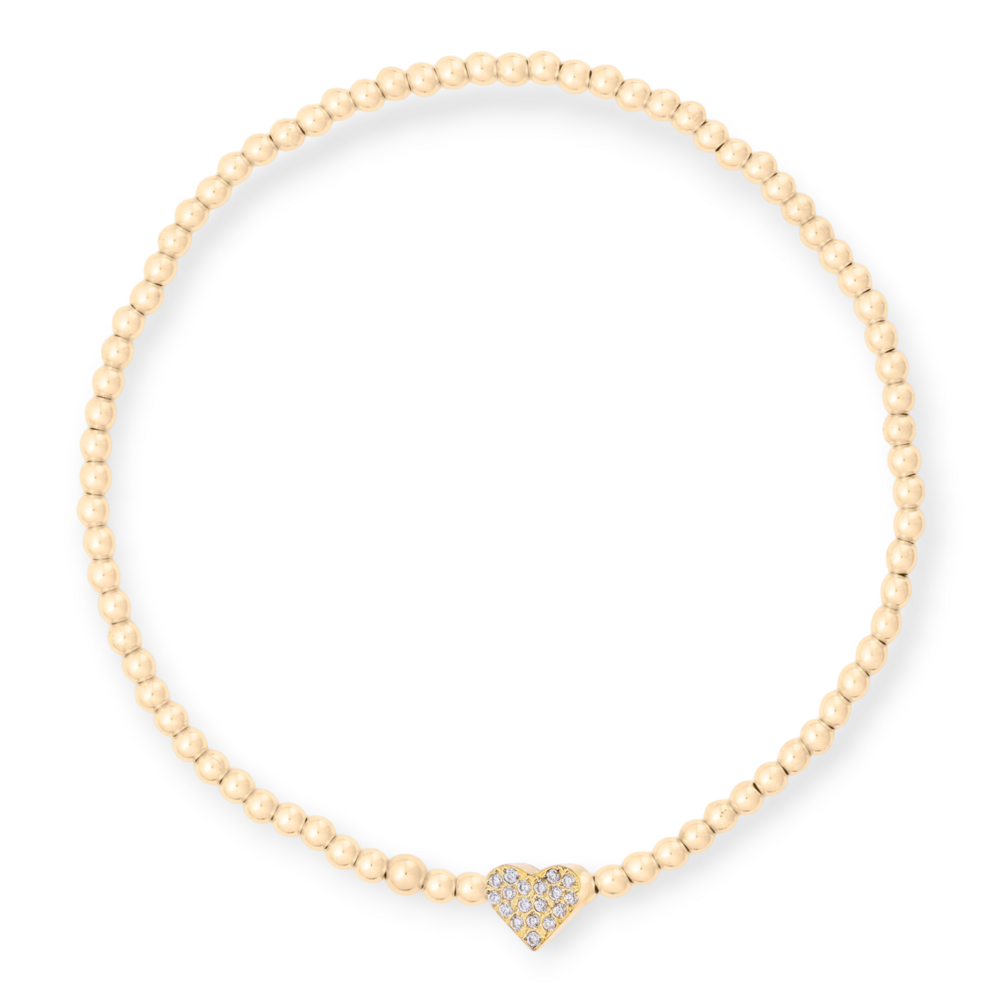 every girl needs a touch of pavé in her stack. 14k gold filled dainty 2.5mm bead on stretch cord with a gold PVD stainless steel heart with pavé cz stones. handmade with recycled metals in the usa.