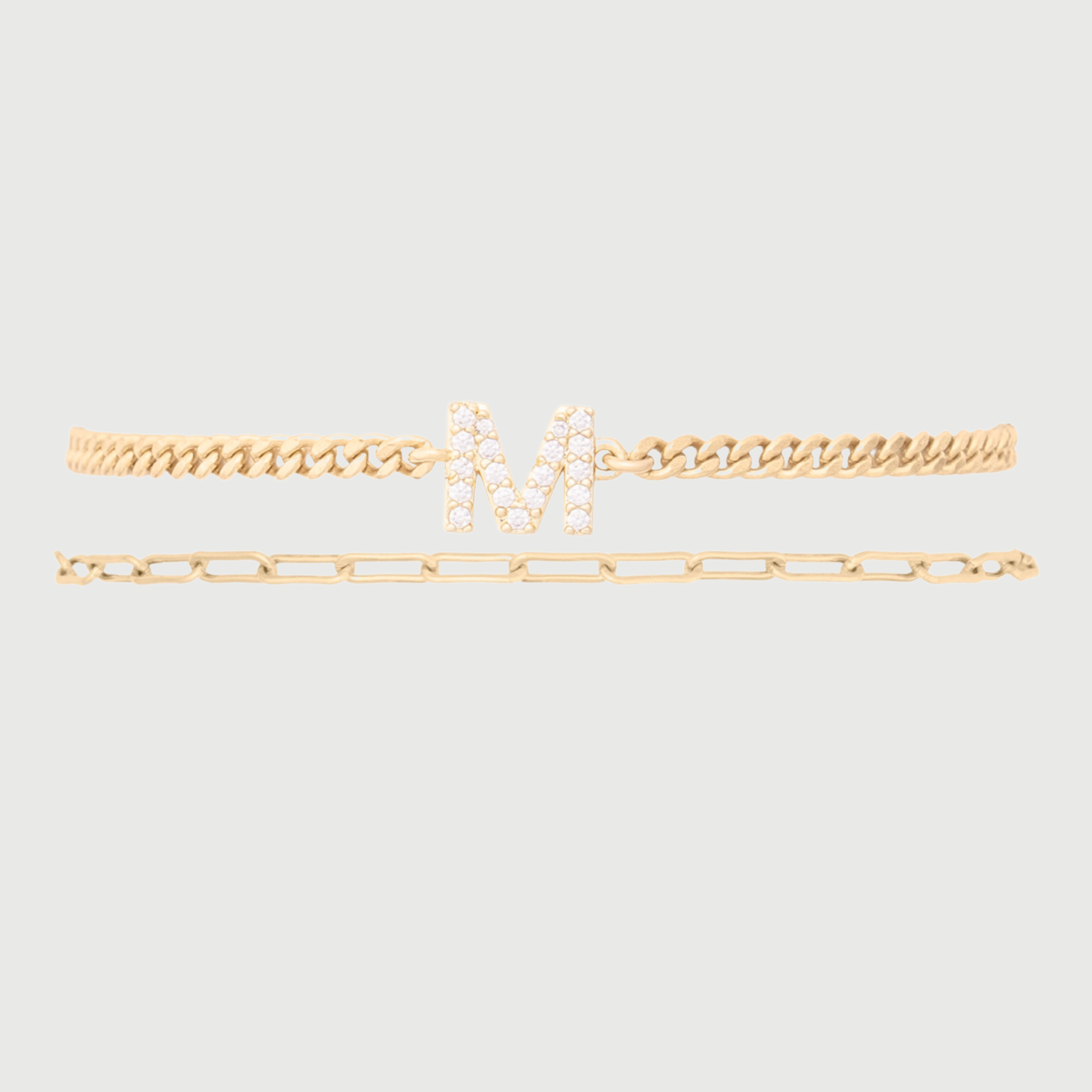 looking for the perfect custom, minimal stack? she's here. this stack includes two 14k gold filled chain bracelets, one dainty paperclip and one classic curb with a custom pavé stainless steel gold PVD initial. handmade with recycled metals in the usa.