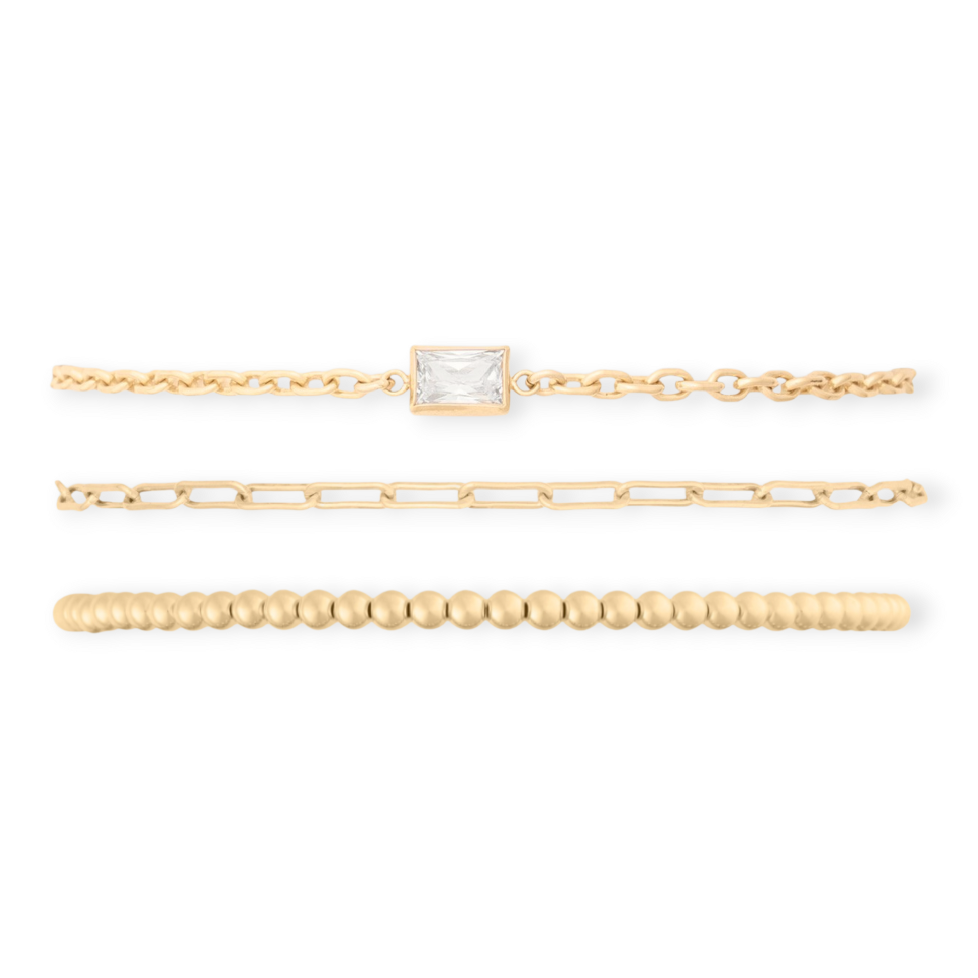 the perfect mix of a little bit of everything. this stack includes all 14k gold filled bracelets with a 3mm 14k gold filled elastic bracelet, a dainty 14k gold filled paperclip bracelet, and a 14k gold filled bezel set rectangle cubic zirconia on a 14k gold filled chain. handmade with recycled metals in the usa.
