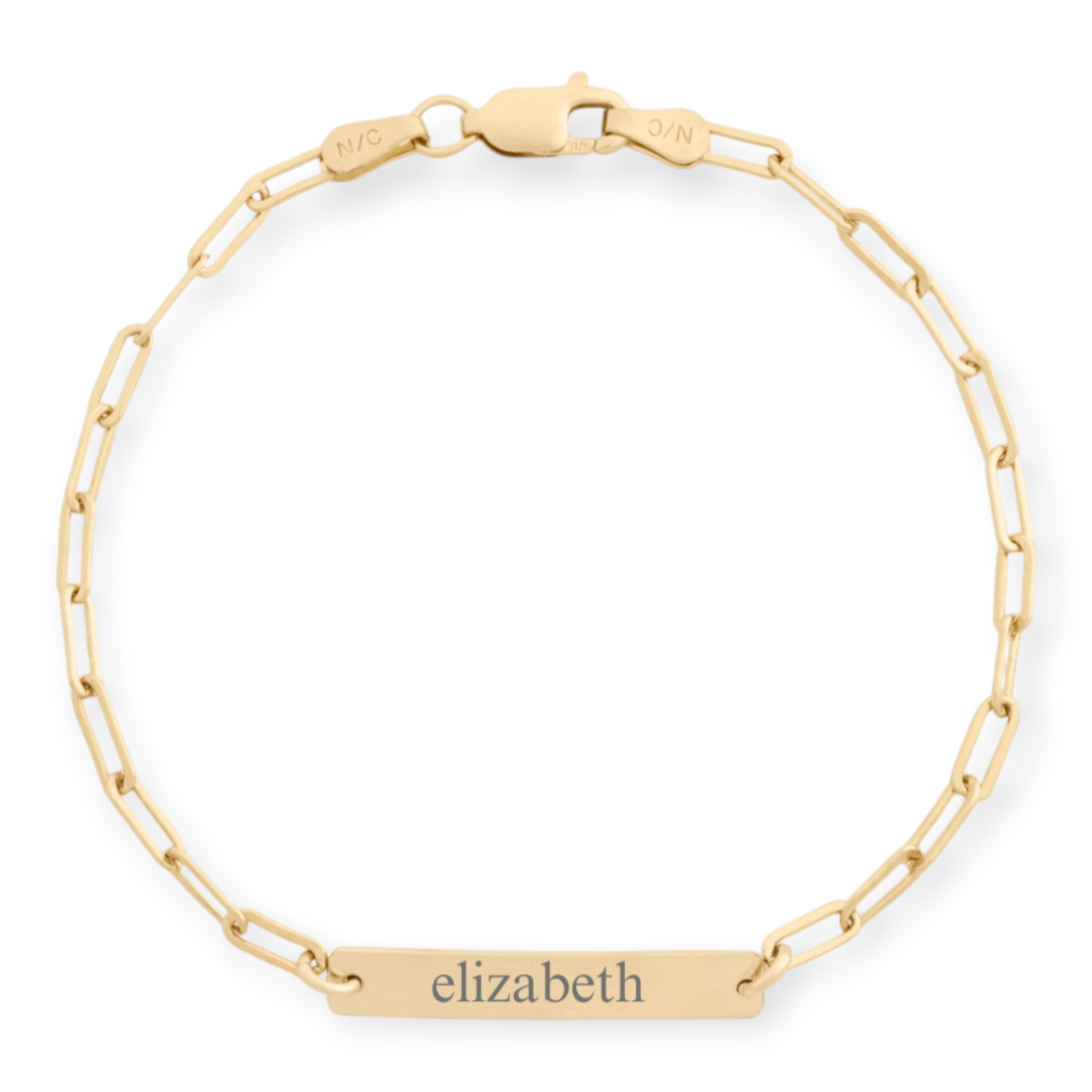 14k gold filled bracelet with a customized 14k gold filled name plate. handmade with recycled metals in the usa. based on its custom nature, this piece is not eligible for returns.