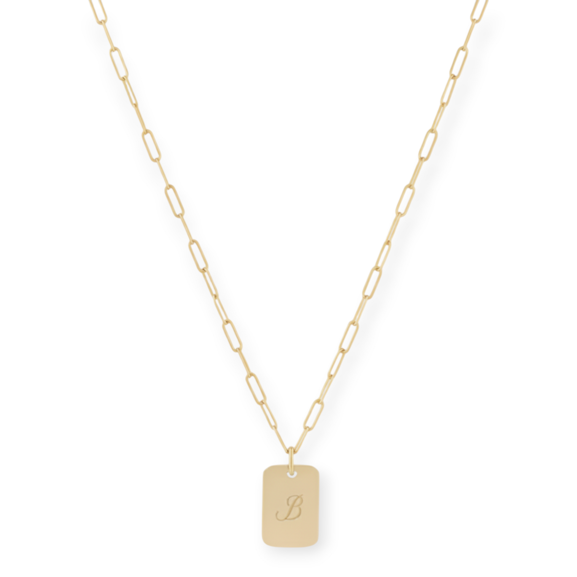18" 14k gold filled paperclip necklace with a 14k gold filled dog tag pendant engraved with your custom initial in a beautiful script font. made with recycled metals in the usa.