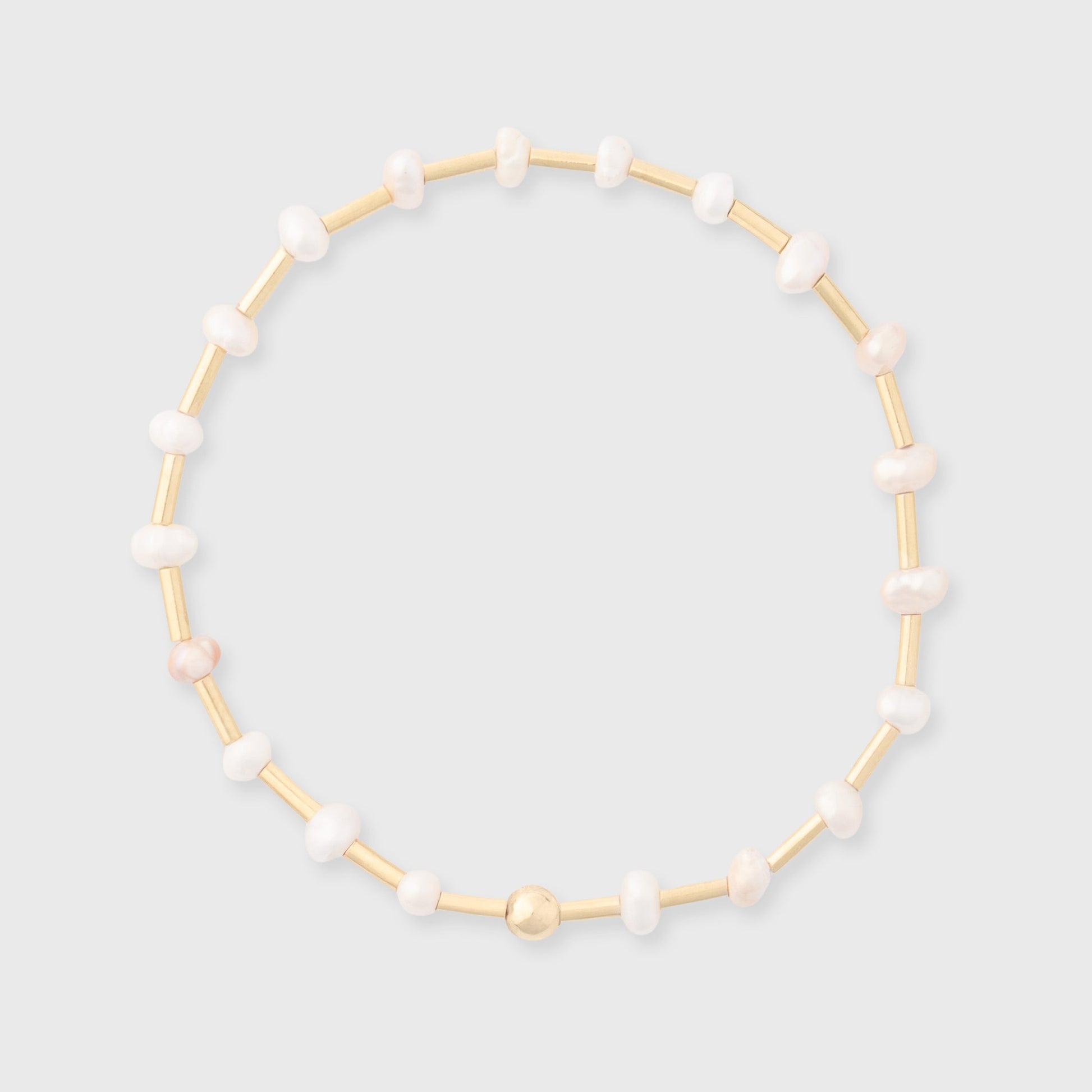this bracelet features gorgeous freshwater pearls connected by 14k gold filled bars on stretch cord. handmade with recycled metals in the usa.
