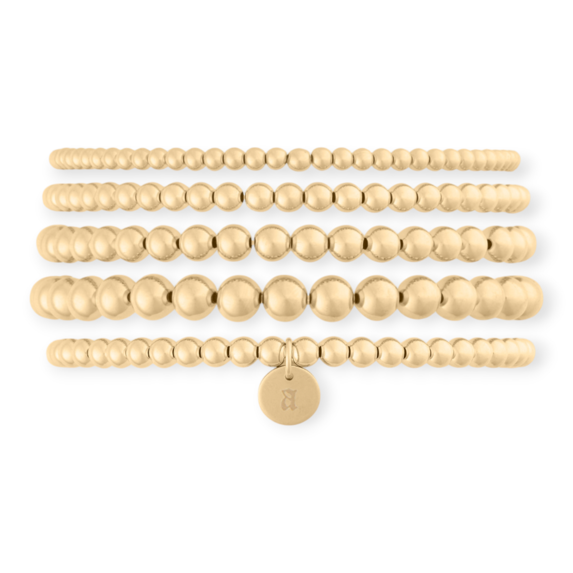the ultimate stack. five 14k gold filled bead bracelet (3+4+5+6mm plain + 4mm with an initial). save 5% when you purchase as a stack. handmade with recycled metals in the usa.