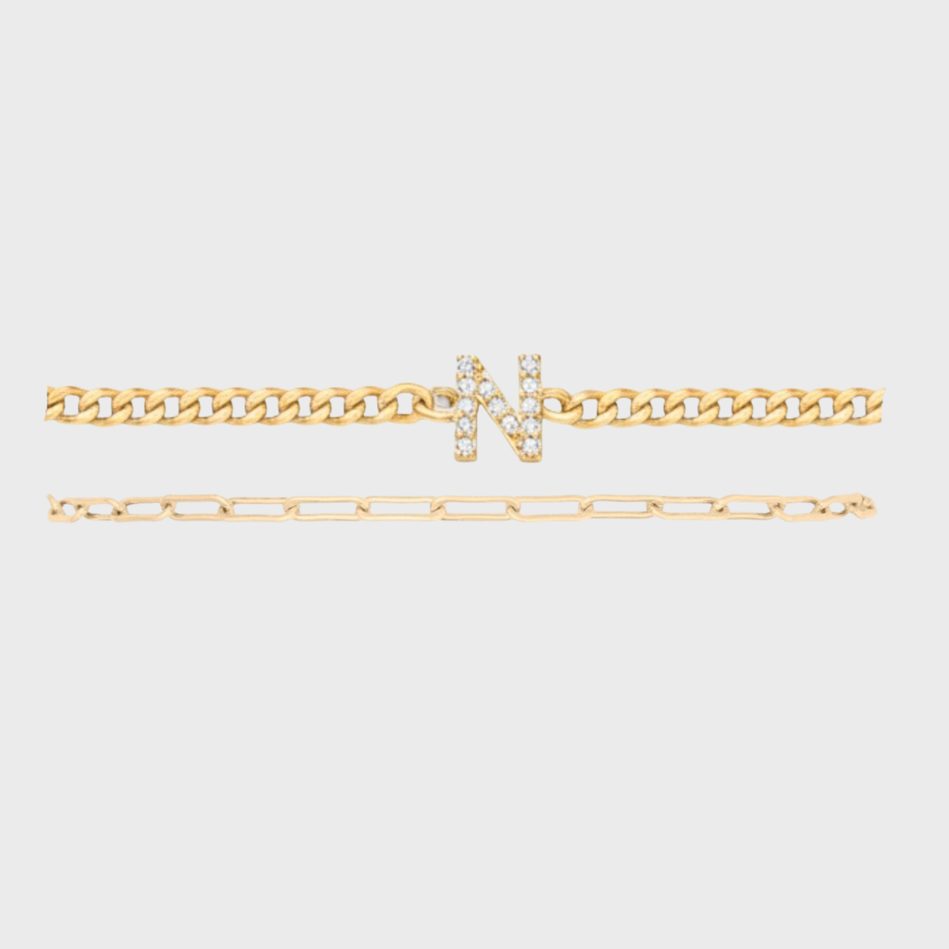 looking for the perfect custom, minimal stack? she's here. this stack includes two 14k gold filled chain bracelets, one dainty paperclip and one classic curb with a custom pavé stainless steel gold PVD initial. handmade with recycled metals in the usa.