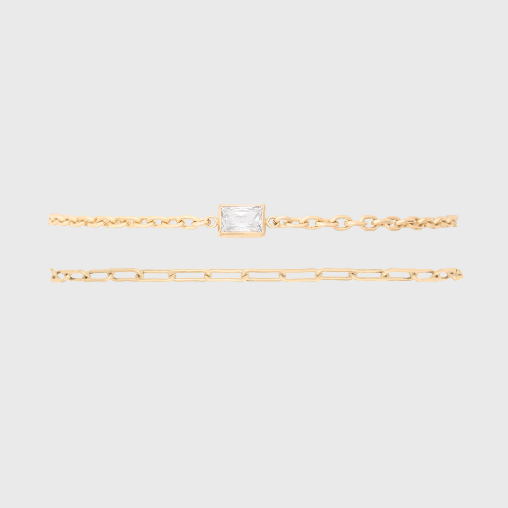 for our dainty loving girls. this set contains two 14k gold filled chain bracelets, one with a beautiful 6mm rectangle bezel set cubic zirconia stone. handmade with recycled metals in the usa.